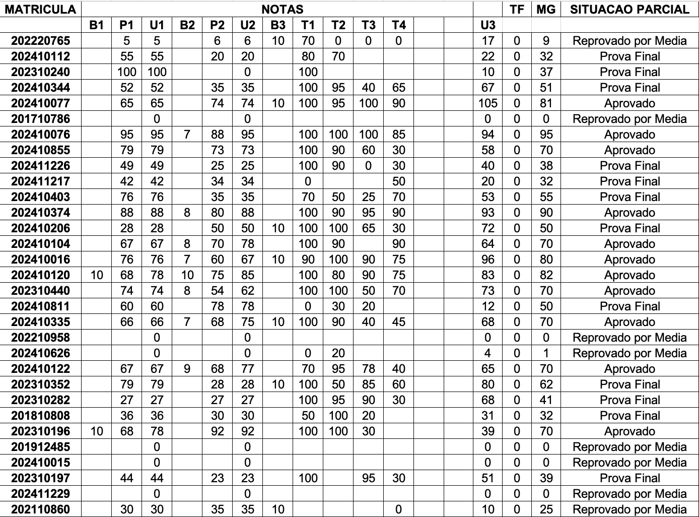 CF = Conceito Final (A=Aprovado, AP=Aprovado na Prova Final, R=Reprovado por Média, RF=Reprovado por Falta, RP=Reprovado na Prova Final)