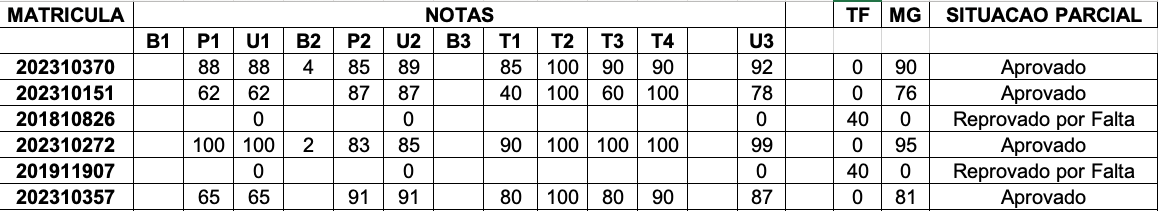 CF = Conceito Final (A=Aprovado, AP=Aprovado na Prova Final, R=Reprovado por Média, RF=Reprovado por Falta, RP=Reprovado na Prova Final)